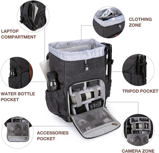 Camera Backpack, DSLR SLR Waterproof Camera Bag, Anti-Theft Photography Backpack with 15 Inch Laptop Compartment, Tripod Holder & Rain Cover, Black